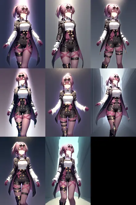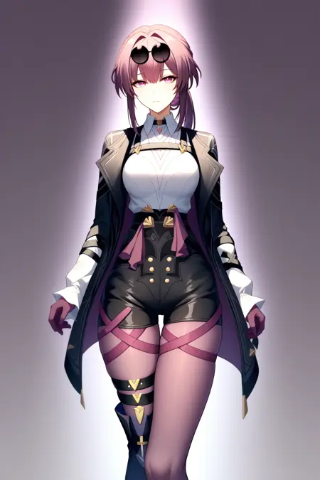 Outfit: NSKafkaHSR, long hair, bangs, sidelocks, ponytail, high-waist shorts, purple pantyhose, purple gloves, white collared shirt, eyewear on head, sunglasses, jacket on shoulders, asymmetrical legwear, black footwear, asymmetrical footwear, single thigh strap, single thigh boot, criss-cross straps