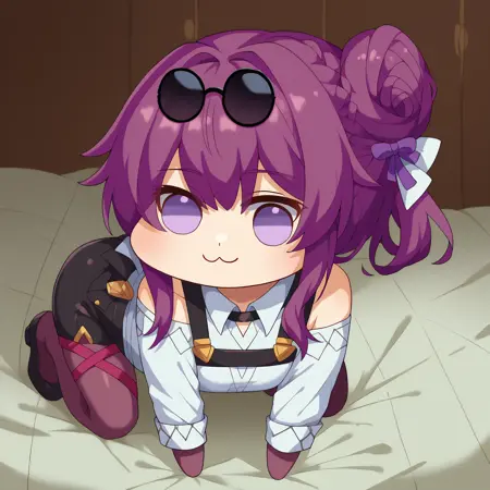 특성 태그: 보라색 머리카락, 텅 빈 눈, 동공 없음, 짧은 단발머리, 보라색 눈(텅 빈 눈이 다른 색을 출력할 경우 대체 사용)