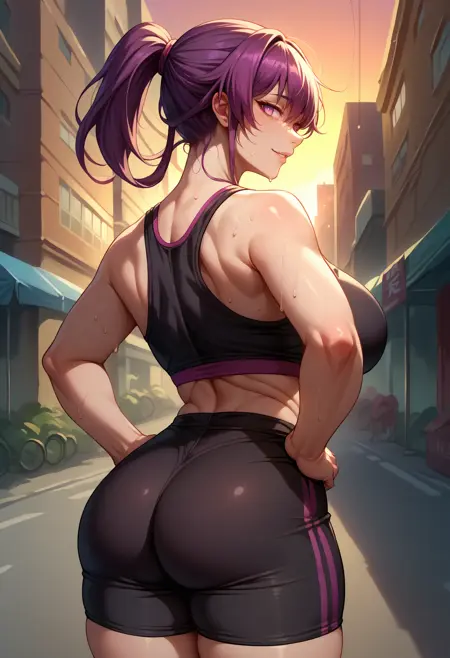 기본 복장: 보라색 머리카락, 텅 빈 눈, 동공 없음, 큰 가슴, 선글라스, 안경을 머리에 올린 상태, 진주 귀걸이, 칼라 셔츠, 흰색 셔츠, 검은 목줄, 가슴 하네스, 보라색 장갑, 허리 높은 반바지, 검은 반바지, 십자가 형태의 스트랩, 보라색 팬티스타킹