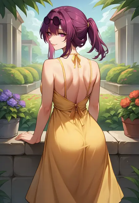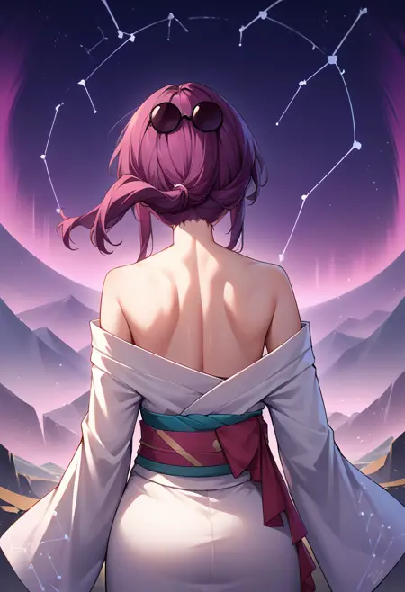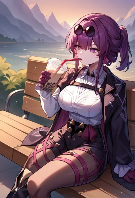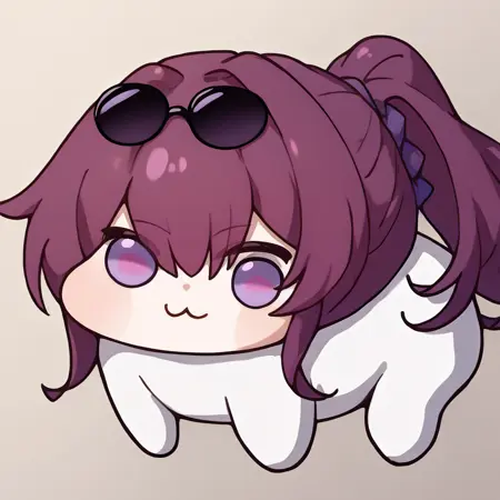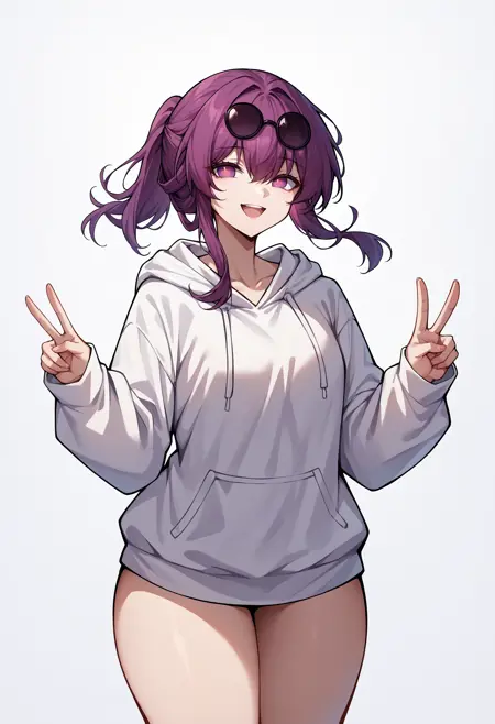 Custom Outfit: KafkaHSR, purple eyes, long hair, ponytail, sidelocks, sunglasses on head