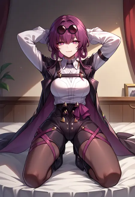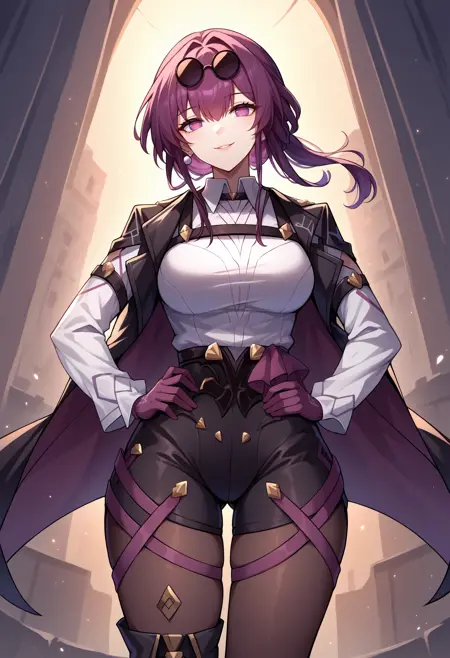 Default Outfit: KafkaDefault, purple eyes, long hair, ponytail, sidelocks, sunglasses on head, earrings, black coat, coat on shoulders, white shirt, collared shirt, long white sleeves, chest harness, purple gloves, high-waist shorts, black shorts, purple straps, pantyhose, asymmetrical footwear, single thigh boot