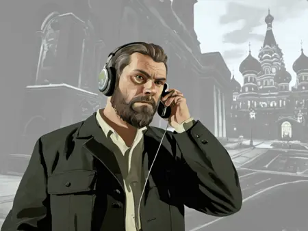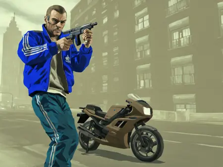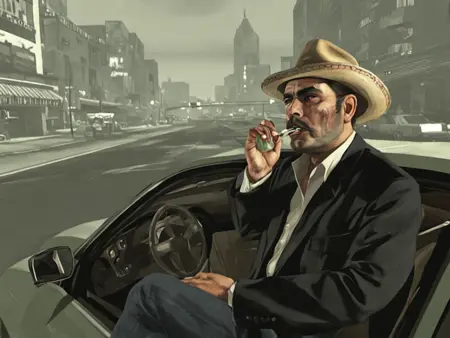 Generate GTA IV "loading screen" style art, with a colored character in front, and a less colored / gray tinted background.