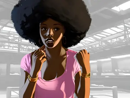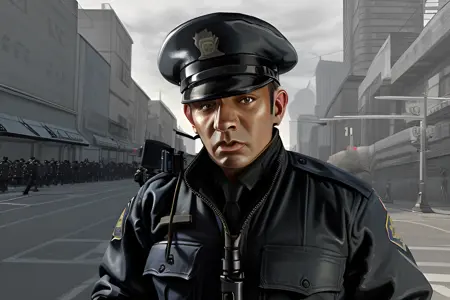 Generate GTA IV "loading screen" style art, with a colored character in front, and a less colored / gray tinted background.