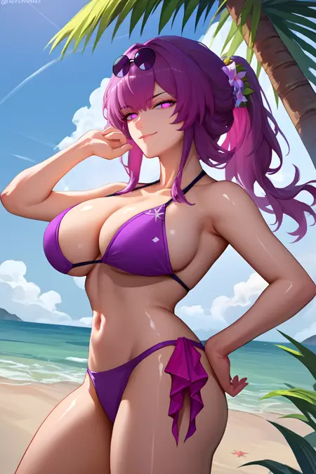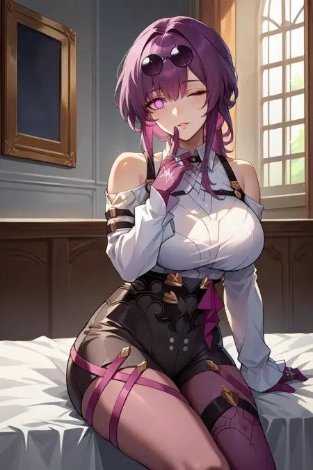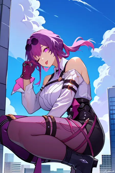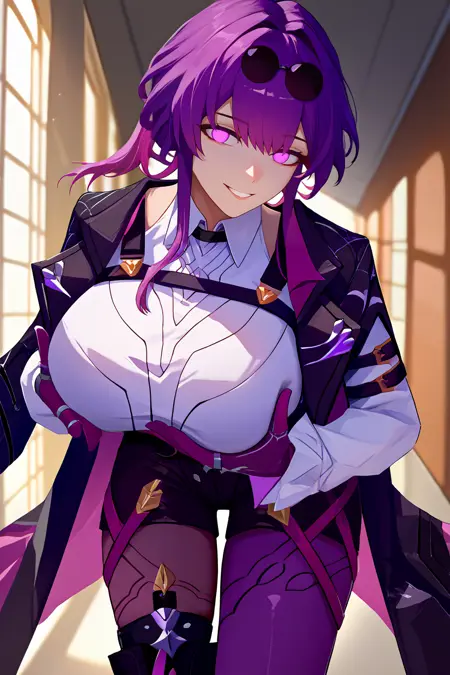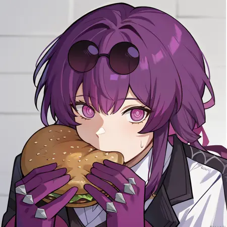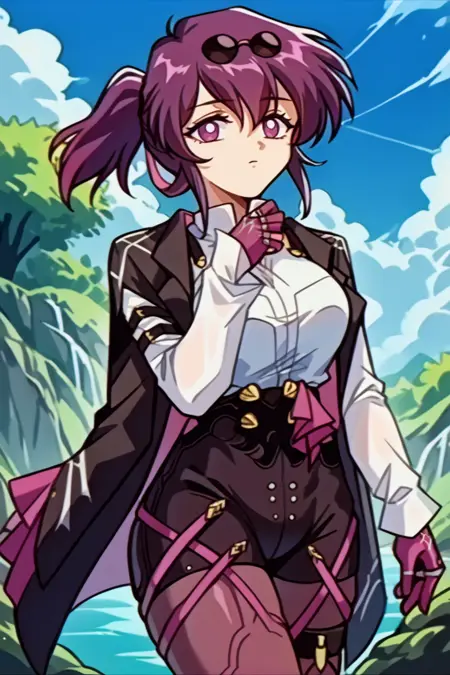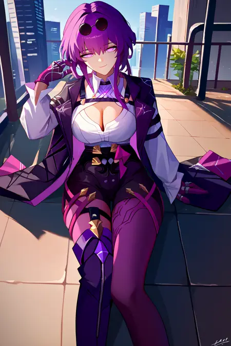 Triggers: hsrkf, purple hair, purple eyes, blank eyes, low ponytail, sunglasses on head, black jacket, collared shirt, white shirt, long sleeves, high-waist shorts, black shorts, purple gloves, black shorts, purple straps, thigh straps, purple pantyhose, single thighhigh, boots (replace "black jacket" with "bare shoulders" to remove jacket)
