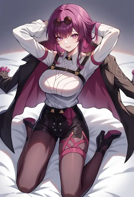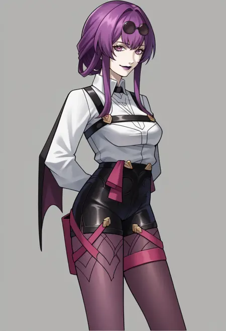 복장: ihavenoideawhokafkaisbutigotpeerpressured, 앞머리, 보라색 머리, 보라색 눈, 안경을 머리에 착용, 칼라 셔츠, 장갑, 재킷, 스타킹, 비대칭 하의, 한쪽 허벅지 부츠, 검은 샌드
