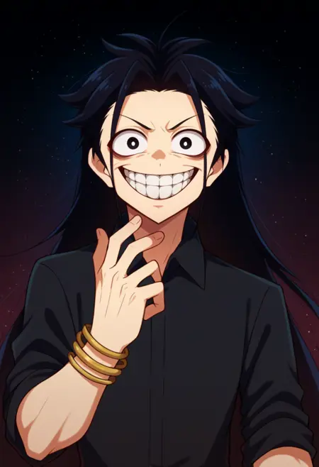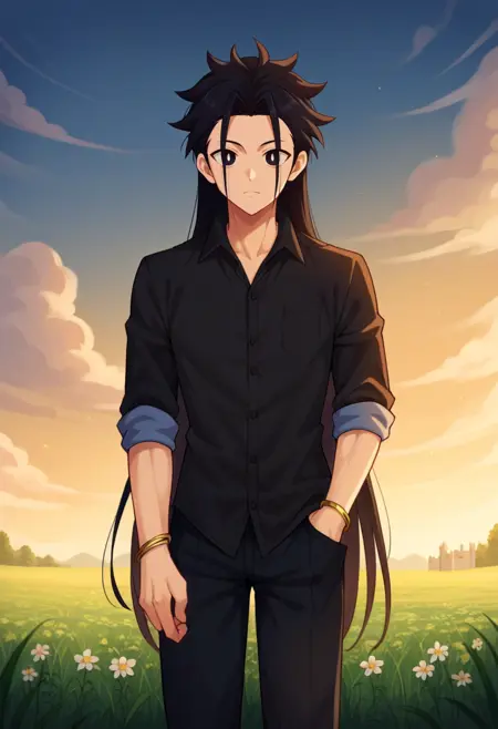 Outfit 1: ["jade_def, black eyes, black hair, very long hair, bright pupils, black shirt, sleeves rolled up, black pants, bracelet"]