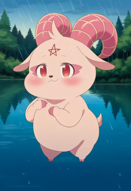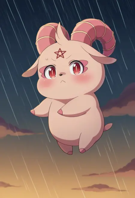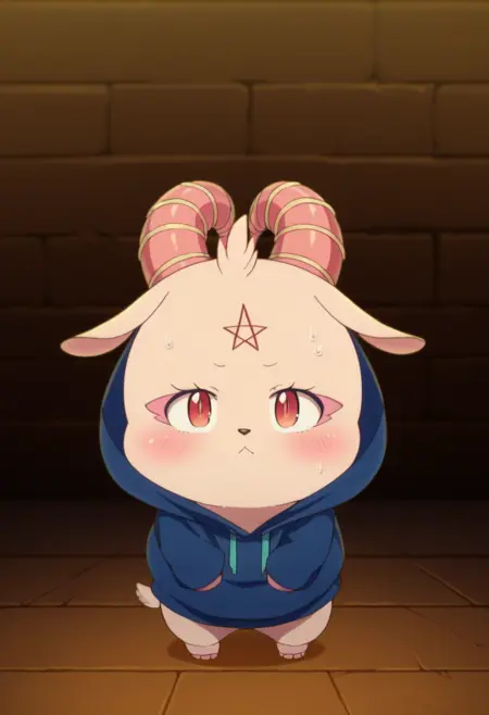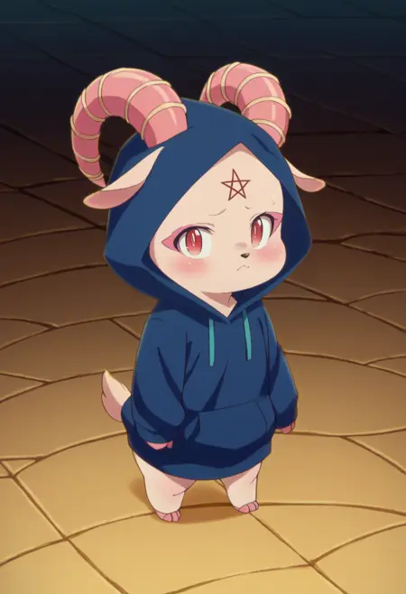 服装1:["grim_def, 无人类, 额头标记, 卷曲角, 粉色角, 粉色眼线, 红色眼睛, 星星(符号), 面部标记, 脸红, :3, 动物鼻子, 生物, 下垂耳朵, 短尾巴"]