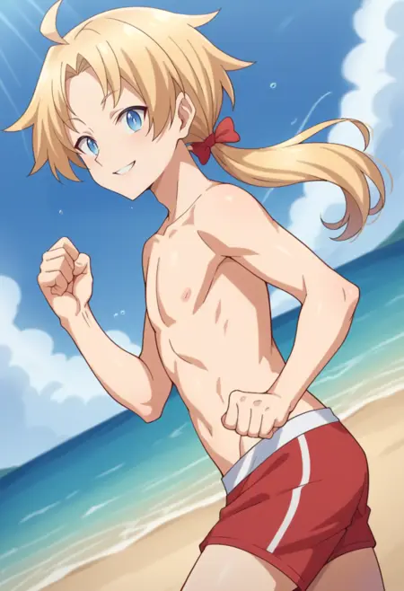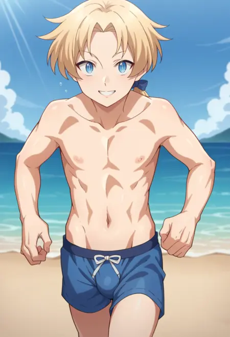衣装1: ["albert_def, 青い目, 金髪, 低めのポニーテール, 髪飾り, 三七分前髪, 白シャツ, 赤いベスト, ポロシャツ, アスコット, 袖をまくった, ベージュのズボン"]