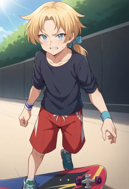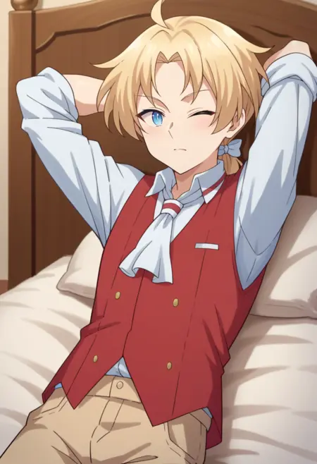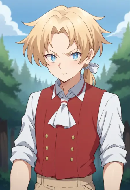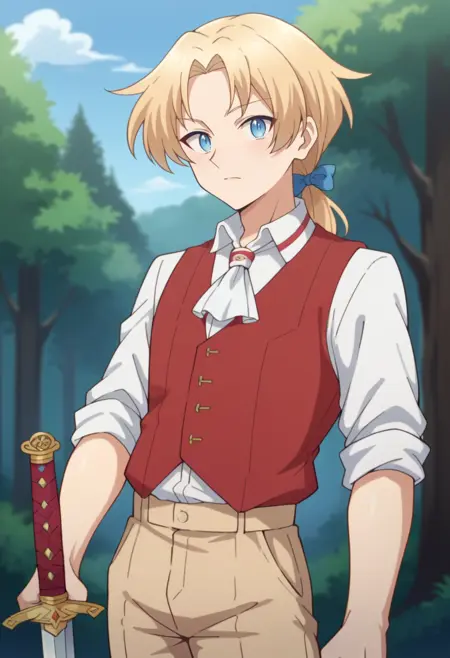服装1:["albert_def, 蓝眼睛, 金发, 低马尾, 发带, 中分刘海, 白色衬衫, 红色背心, 带领子衬衫, 领结, 袖子卷起, 米色长裤"]