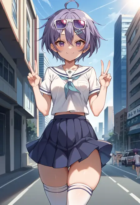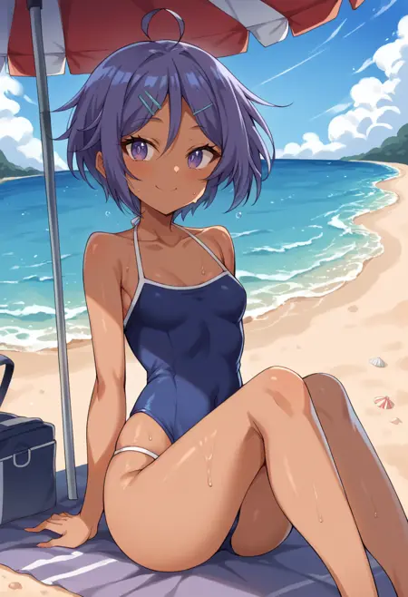 의상: ["ren_def, 보라색 머리, 단발, 헤어클립, 보라색 눈, 검은 피부를 가진 여자, 아호게, 파란 스카프, 드러나는 옷, 흰색 속팬티, 하이레그 팬티, 녹색 벨트, 손가락 없는 장갑, 검은 다리 착용, 챕스, 뒷면이 열린 바지, 붕대 감긴 팔, 세로 줄무늬 히프 하이, 비대칭 다리 착용, 불균형 장갑"]