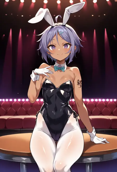 服装:["ren_def, 紫色头发, 短发, 发夹, 紫色眼睛, 深肤色女性, 天线辫, 蓝色围巾, 露肤服装, 白色内裤, 高开衩内裤, 绿色腰带, 无指手套, 黑色腿部装备, 马裤, 露背裤, 手臂绷带, 垂直条纹长筒袜, 不对称腿部装备, 不均匀手套"]