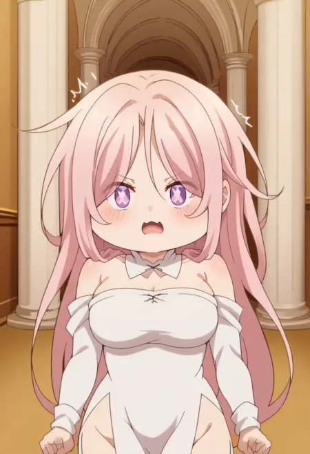 의상: ["talia_def, 보라색 눈, 분홍색 머리, 긴 머리, 한쪽 눈을 가린 머리, 중간 갈라진 앞머리, 분리된 칼라, 흰색 드레스, 긴 소매, 어깨 노출, 측면 슬릿"]