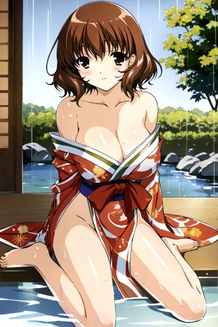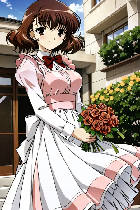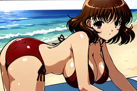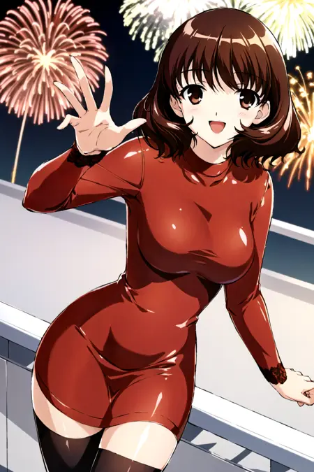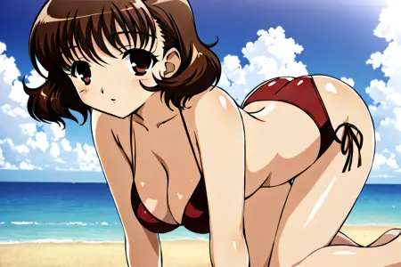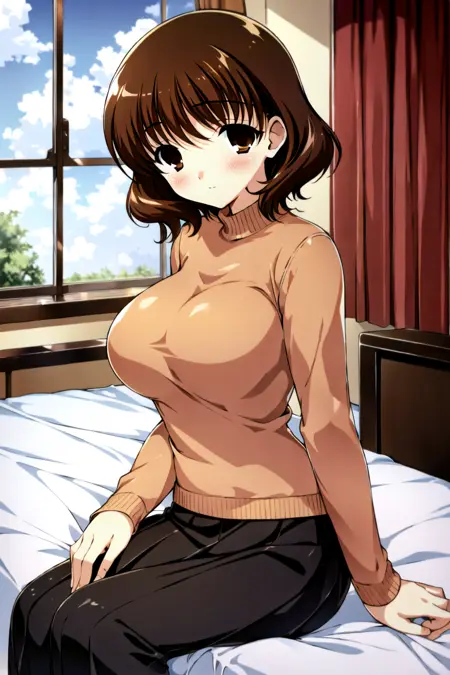Basic prompt: Solo, 1girl, short hair, brown hair and eyes, red sweater, pleated skirt, blue skirt, OomuraYumi,
