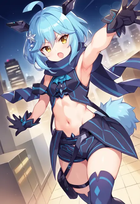 青いスカーフ、肩出し、おへそ、ショートショーツ、黒い手袋、青い太もも長ズボン、