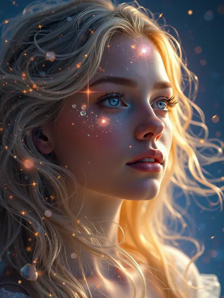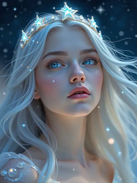 "空灵星之公主,薄纱长裙,闪烁星尘,精致光环,光芒四射的美。夜空,发光星座,柔和光线,梦幻氛围,迷人魅力。"