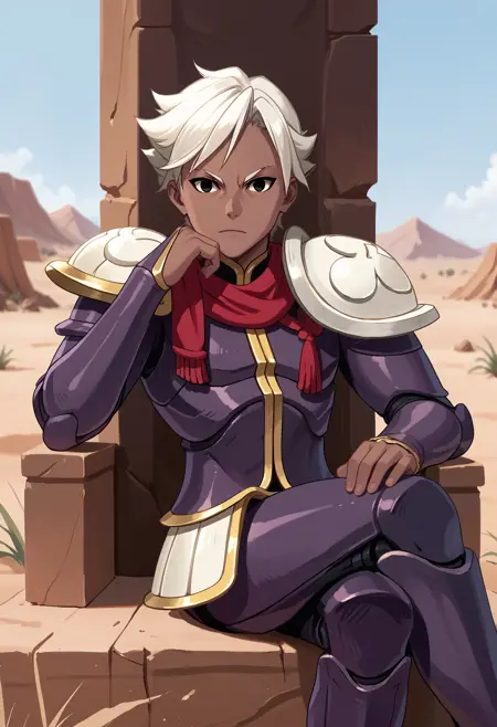 purple armor, white shoulder armor, red scarf, single pauldron, fingerless gloves, purple boots, armored boots - his "default" outfit