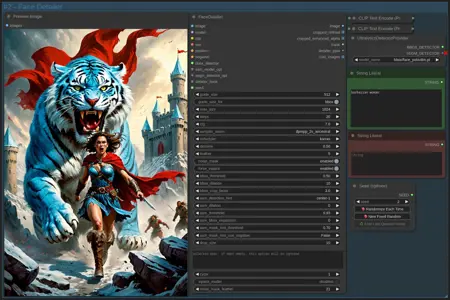 次に、シードを固定し、次のグループ「フェイスディテイラー」を「常に有効」に設定してください。任意のグループをバイパスしても構いません。この段階でのシードはデフォルトで固定されていますが、生成された顔が不満足な場合は別のシードを設定してください。また、生成される顔をより詳細に制御したい場合は、新しいプロンプトボックスが追加されています。