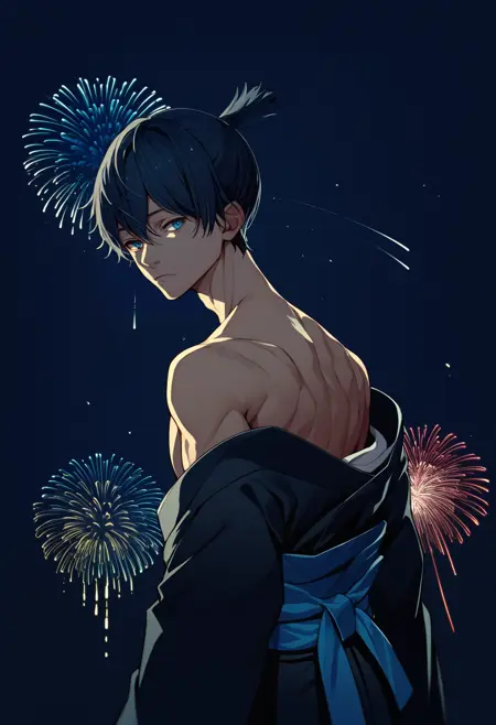 トリガー+外見: hayakawa aki, 黒髪, 髷, 青い目