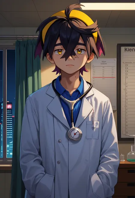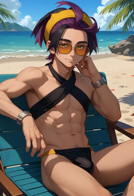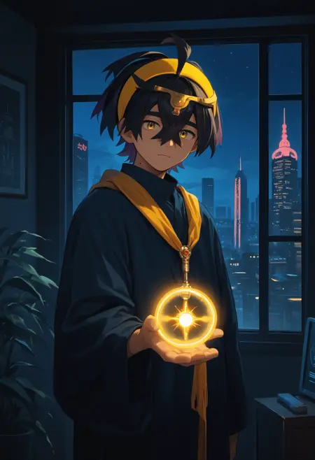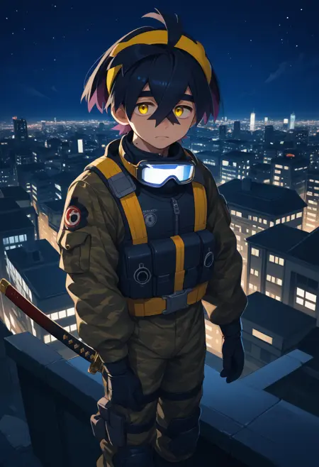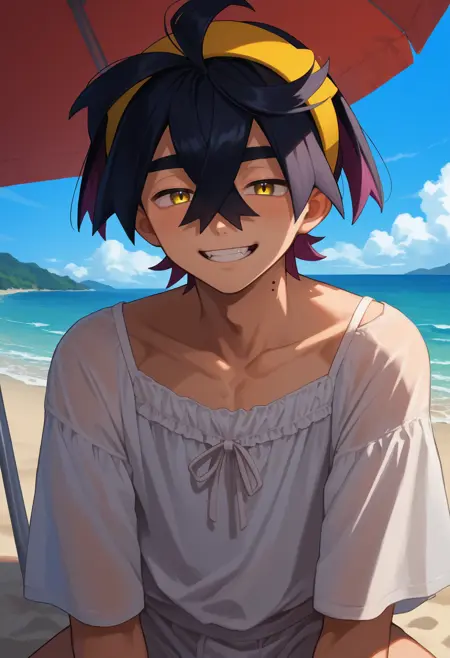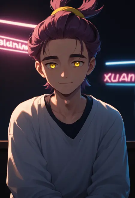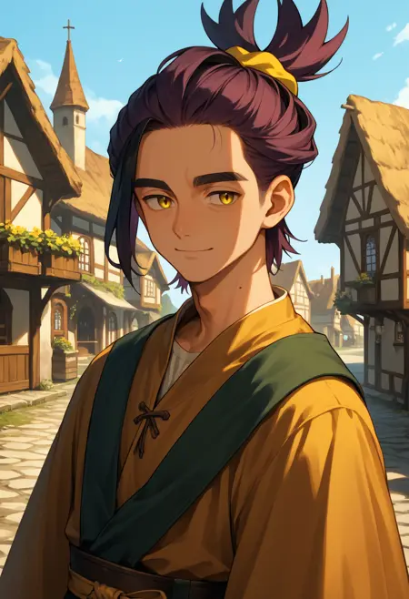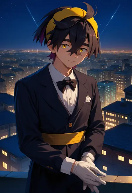 하나의 사전 학습된 옷을 사용할 때, 남성 중심, 단발, 노란 눈, 목에 점이라는 기본 정보를 반드시 추가하세요.