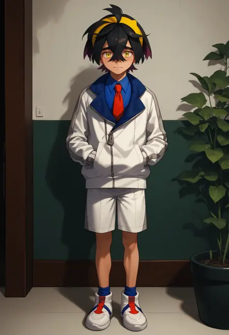 "머리 아래로": bbachdo, 노란 헤어밴드, 흰 재킷, 빨간 넥타이, 흰 반바지, 양말, 신발, 파란 칼라, 단추 채운 재킷, 트랙 재킷,