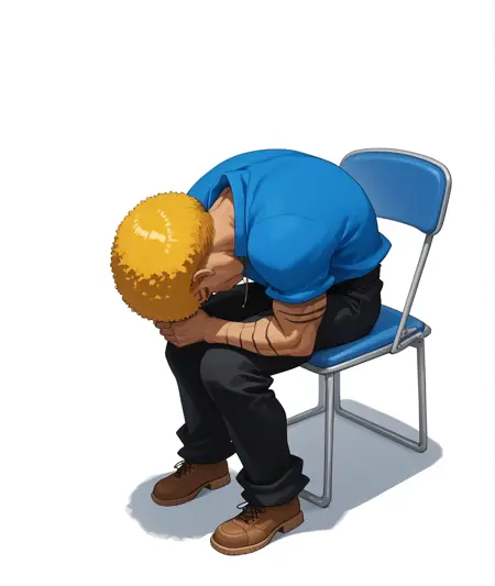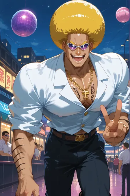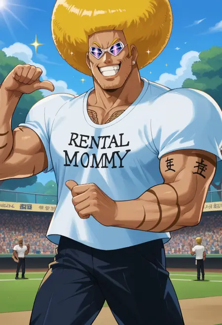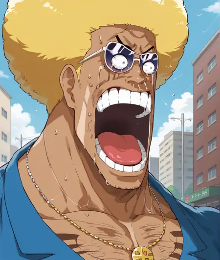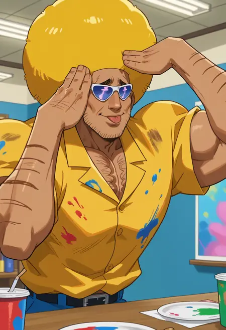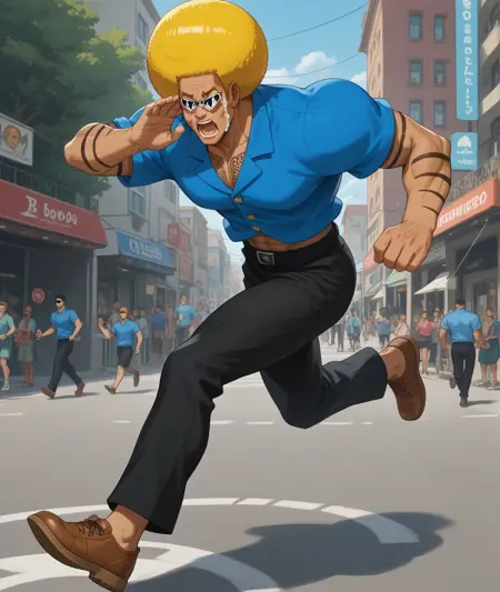 bobobo-bo bo-bobo, 아프로, 금발, 근육질, 파란 셔츠, 선글라스, 가슴 털, 팔 털, 검은 피부 남성, 남성스러운