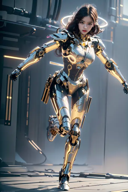 示例 promt:masterpiece,(bestquality),highlydetailed,ultra-detailed,1girl,(mechanicalwings:golden,glowingeyes:blue,silverarmor:1.2,elongatedears:0.8),(cyberpunkcity:1.5,weapon:energyblade),(fantasylandscape:1.2,natural lighting:1.5,confidentexpression),(panorama:1.2),mecha, smile,lora:机甲少女:0.5