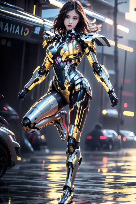 该lora用于为人物更换机甲皮肤,风格为写实的机甲,完美适配赛博朋克等风格