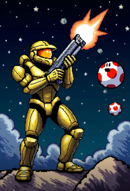 このスーパーマリオワールド2:ヨッシーアイランドのスタイルで、SNESのピクセル完璧さをお楽しみください。このスタイルはエポックと重みを正確に調整するのが少し難しかったですが、サポートキーワードと高い強度を活用することで、完成しました。これにより、ほとんどのシーンや被写体に独自のピクセルアートスタイルを導入できます。