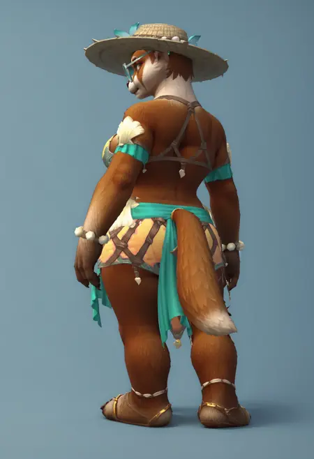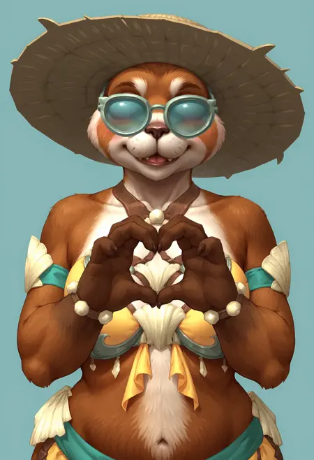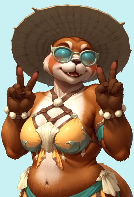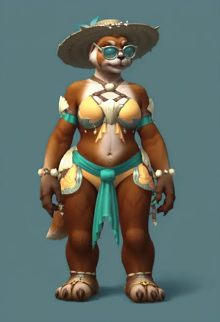 • 1girl, breasts, furry, navel, sunglasses, loincloth, bracelet, straw hat, hat, jewelry, bikini, tail, shell