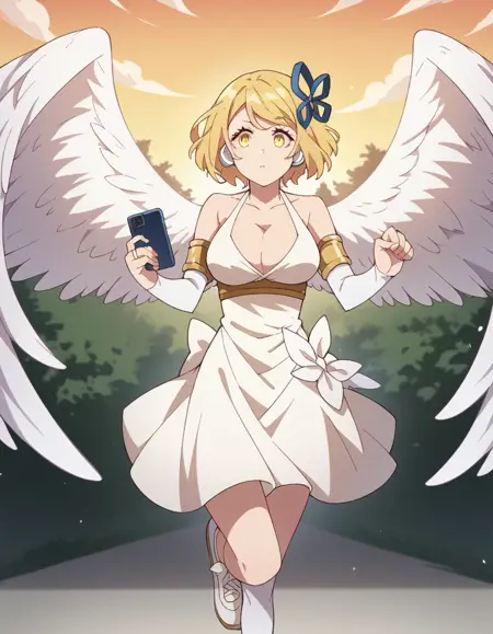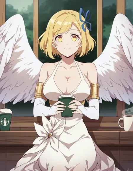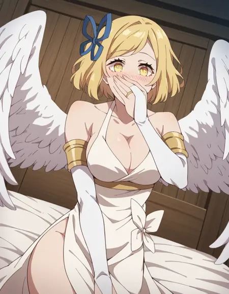 gloves, dress, cleavage, bare shoulders, wings, white dress, bridal gauntlets, feathered wings, angel wings, white wings, angel,