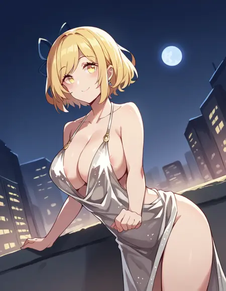 lora:farming-isekai-tia-s1-ponyxl-lora-nochekaiser:1, tia, short hair, blonde hair, ribbon, hair ribbon, yellow eyes, large breasts,