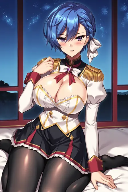 학교 유니폼: 클리브리지 컷아웃, 어깨장식, 검은 치마, 긴 소매, 줄리엣 소매, 검은 팬티하이즈