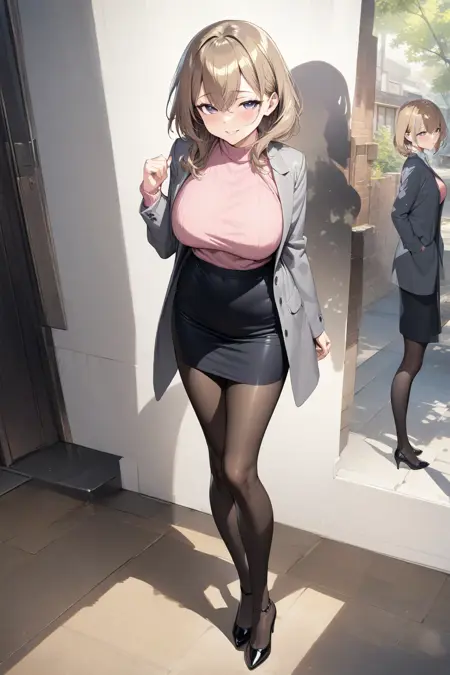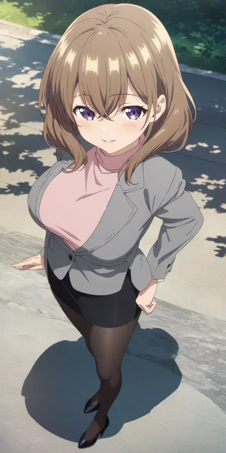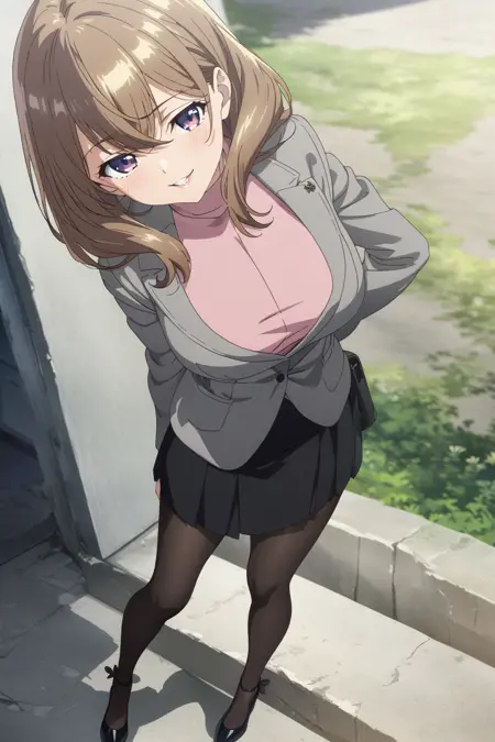 「senpai, brown hair, purple eyes, large breasts,」を使用してアクティベート。服装タグは「ピンクのセーター、グレーのジャケット、黒のスカート、黒のパンティストッキング、黒のヒール」。でも正直、彼女の服装のタグが本当に必要ですか?それは日常生活の服で、毎日少し変化があるだけです。たまにパンティストッキングを履かないこともあれば、セーターが青に変わることもあります。あなたたちならどうタグ付けすべきか、ちゃんとわかるでしょ。