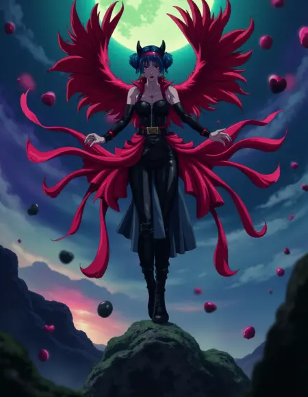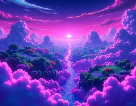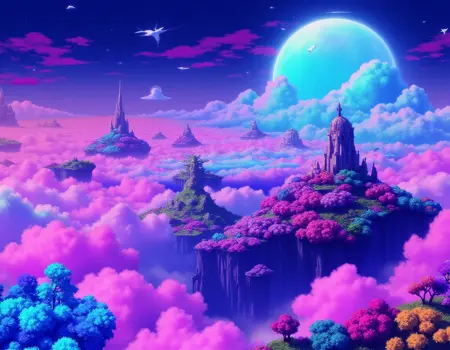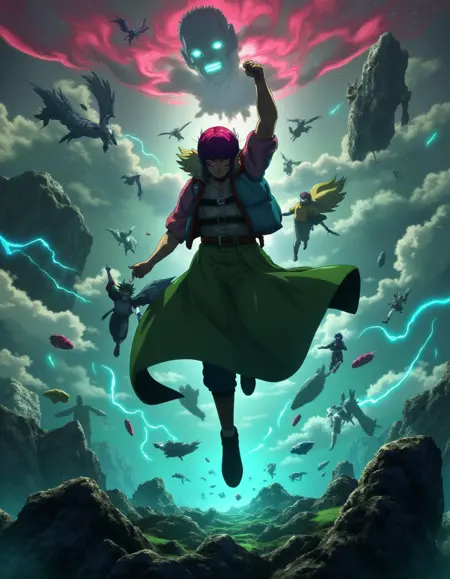 "SuicideSquadIsekai, 浮遊する島々が渦巻く雲の間を漂い、ネオン色に光る発光する植物が広がる鮮やかな風景。"