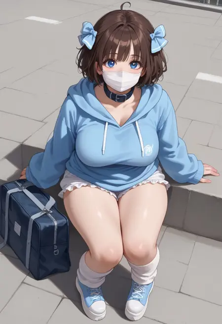 mizuiro, oversized hoodie, bloomers, stockings, platform shoes, school bag, hair ribbons, belts, face mask