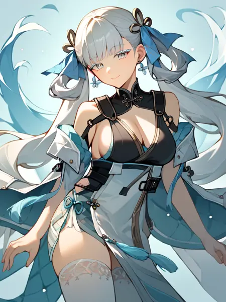 jinhsi (wuthering waves), white hair, very long hair, twintails, multiple hair bows, low twintails, long hair, white eyes, white eyelashes, earrings, large breasts, medium breasts, cleavage, white bow, black dress, white pupils, mole on cheek, black collar, white coat