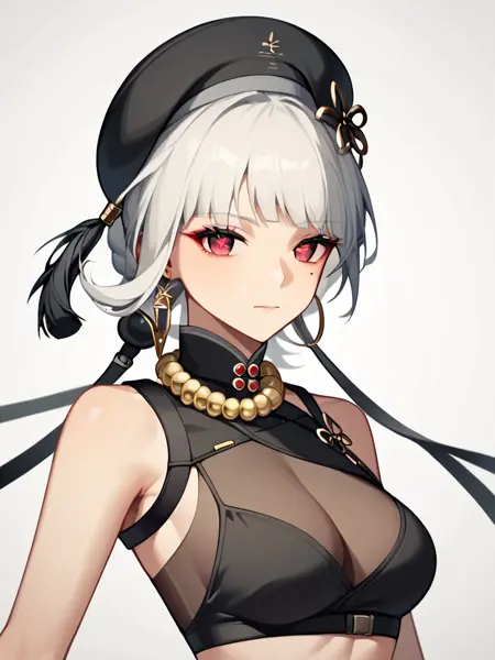 character: sanhua (wuthering waves), grey hair, black pantyhose, short hair, white hair, red eyes, large breasts, medium breasts, black hat, black shirt, black skirt, tacet mark (wuthering waves), bead necklace, bare shoulders, beret, black gloves, crop top, bead bracelet, mismatched pupils