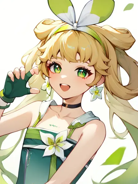 verina (wuthering waves), blonde hair, green hairband, bow hairband, very long hair, twintails, green eyes, flower earrings, green footwear, green dress, tacet mark (wuthering waves), sleeveless dress, green bow, white flower, white gloves, fingerless gloves, bare shoulders, white shorts, white leg warmers