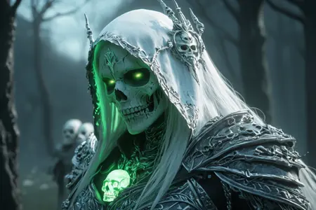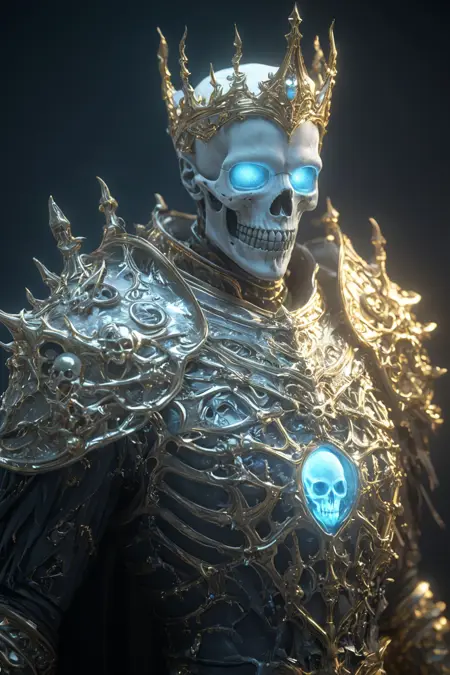 "細密な黄金の鎧をまとう、冷たく幽霊のような骨格の王のクローズアップ。輝く目をもつ王の周囲には、暗い海に浮かぶ半透明な骨格が漂っている。Unreal Engine風に、映画的で超現実的なスタイルでレンダリングされる。"