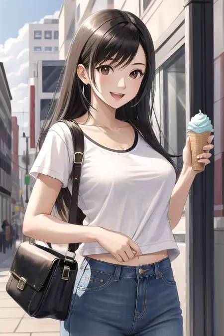 0.7程度のウェイトが効果的です。トリガー語は「tifa ff7」です。「タンクトップ」、「黒のスカート」、「サスペンダー付きスカート」、「ミドルフィット」、「黒のロングスリーブ」、「赤のグローブ」を加えると、彼女の服装の生成に役立ちます。