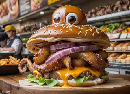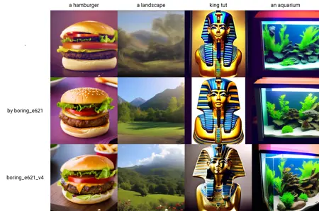 이 모델의 타이틀 이미지는 이 임베딩이 기본 SD 1.5 모델의 네 개의 단순한 프롬프트에 어떤 품질 향상을 줄 수 있는지를 보여줍니다. 예를 들어 첫 번째 열에서 boring_e621_v4는 햄버거를 더 사진처럼 사실적으로 표현하고, 코코볼로 테이블 위에 놓으며, 야채를 새로워 보이게 하고, 치즈 한 조각과 감자튀김을 추가합니다.
