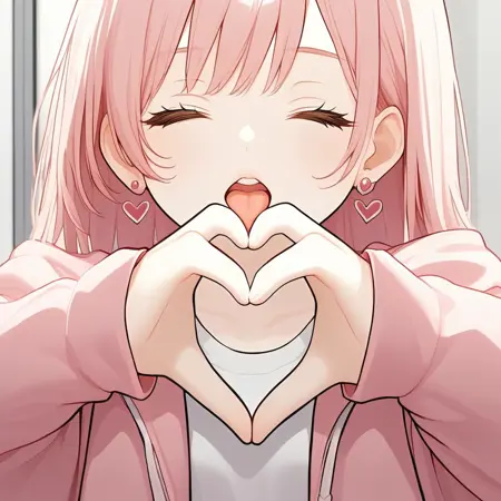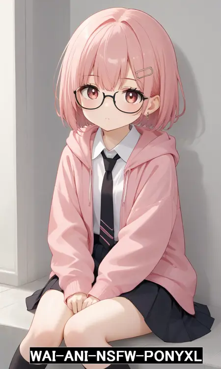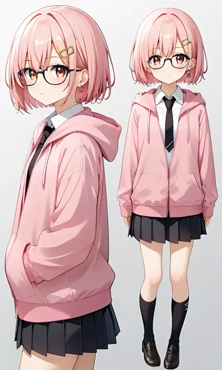 akane,pink short hair,hair ornament, black-framed eyewear, earrings,