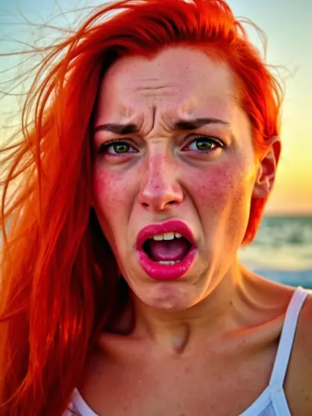 (very disgusted), a close up of a beautiful young woman in a room with disgusted expression. her mouth is distorted by the disgust she feels. She have red hair and freckles and is underwater.
