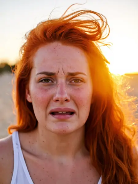 (very sad), a close up of a beautiful young woman in a room with a sad expression, Her mouth is open and twisted of sad. Her eyes were bloodshot from crying. is closed and tearfull. She have red hair and freckles and is underwater