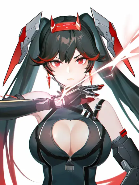 lucia: dawn (pgr),黑发,双马尾,长发,挑染发,渐变发,头发遮眼,红眼,头饰,假角,耳环,红角,露胸,黑裙,无袖裙,lucia (pgr),机械臂,裸露肩膀,单条及膝袜