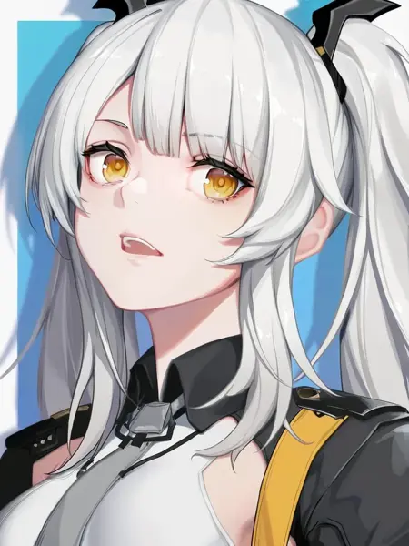 liv: empyrea (pgr),灰发,白发,长发,头发遮眼,灰眼,机械翅膀,军帽,长袖,白裙,机械光环,白帽,黑裙,liv (pgr),黑手套,黑领带,liv: empyrea (dreamcatcher) (pgr),裸露肩膀,微张嘴唇