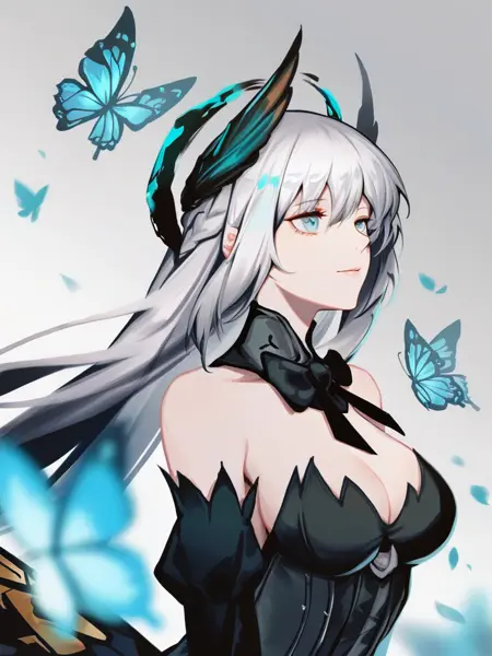 liv:苍穹(梦捕者)(pgr),长发,灰发,白发,灰眼,蝴蝶翅膀,昆虫翅膀,乳沟,中等乳房,黑裙,脱袖,liv:苍穹(pgr),liv(pgr),裸露肩膀,脱领,官方替代服装,高跟鞋,凉鞋,微张嘴唇