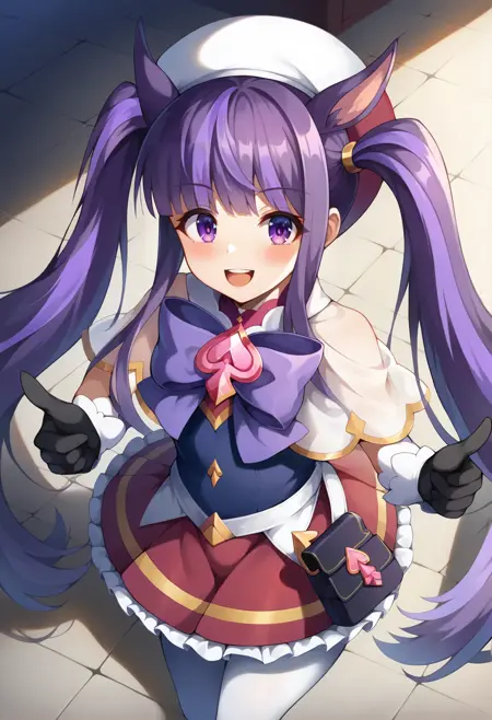 - pcrkasumi, 긴 머리, 추가 귀, 강아지 귀, 강아지 꼬리, ksmmag, 매우 긴 머리, 이색 머리카락, 자주색 머리카락, 마법소녀, 트윈테일, 모자, 커피트, 자주색 리본, 소매 없음, 스페이드_\(형태\), 키홀, 검은 장갑, 프릴 치마, 빨간 치마, 홀스터, 흰색 팬티스타킹, 무릎 부츠, 허벅지 자주색 부츠,