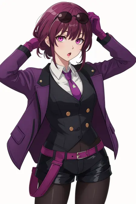 服饰:卡夫卡,紫色头发,紫色眼睛,长发,夹克,墨镜,眼镜戴在头上