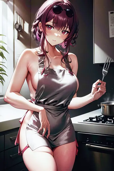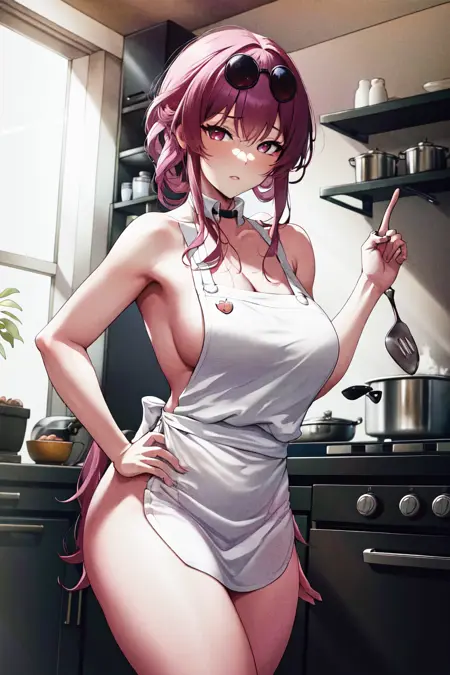 服装: 太阳镜、头戴眼镜、项圈、长袖、有领衬衫、露肩、黑色短裤、紫色手套、紫色绑带、连裤袜、臂带、耳环、大腿靴、大腿绑带